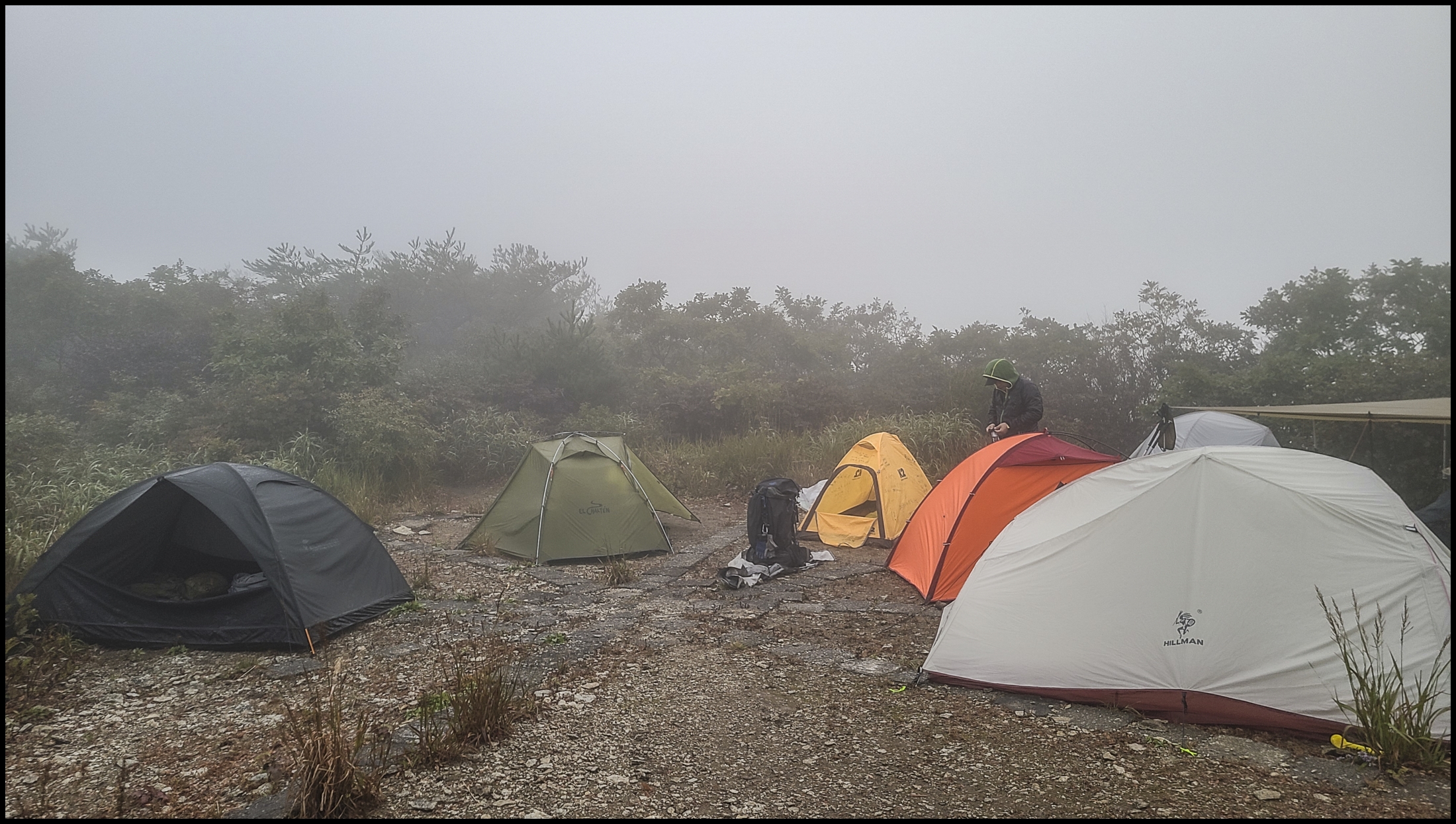 보일뿐 조망은 전혀 보이지 않습니다. 텐트 밖으로 나와 새벽 비에 젖은 텐트를 정리하여 배낭에 넣은 후