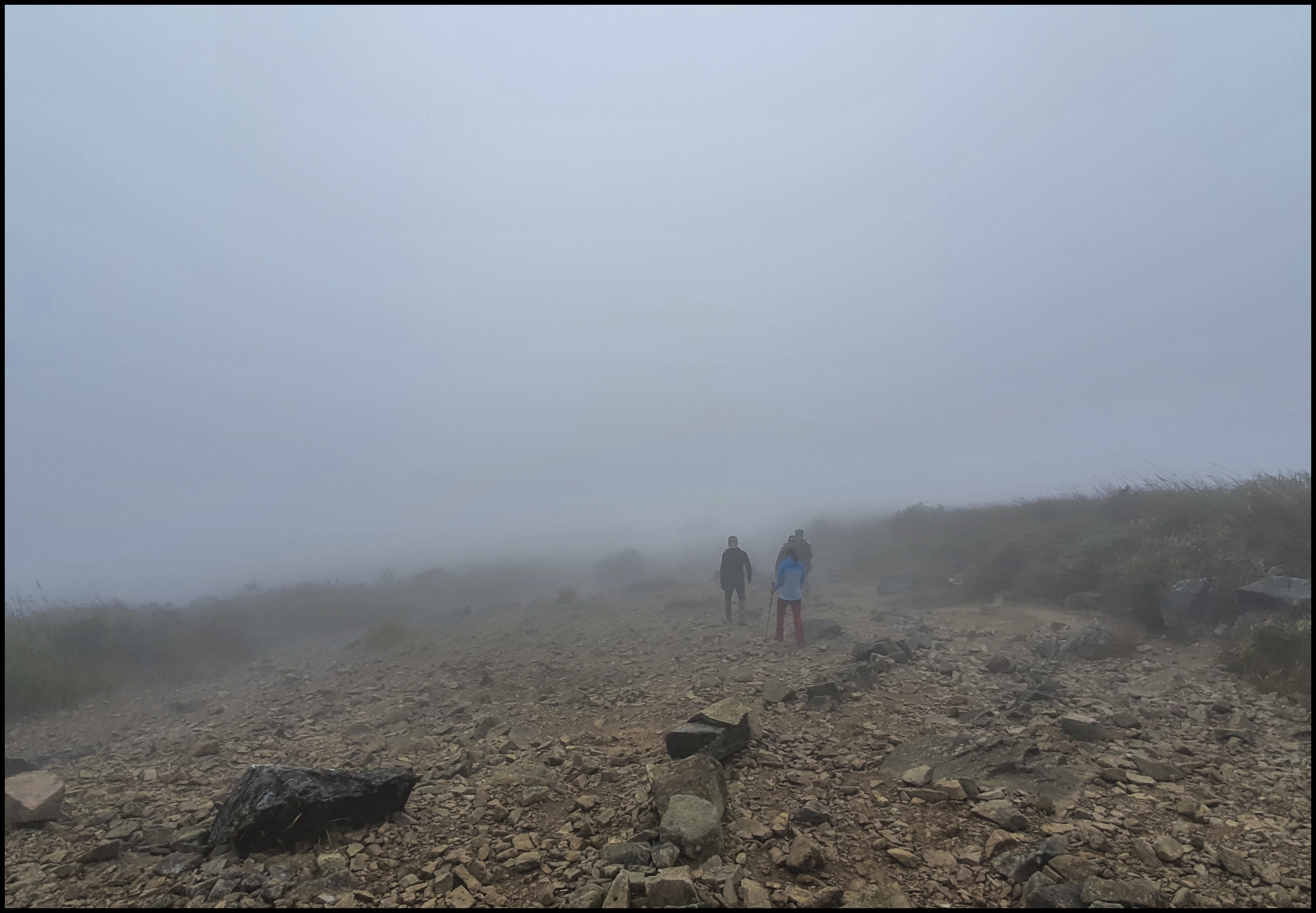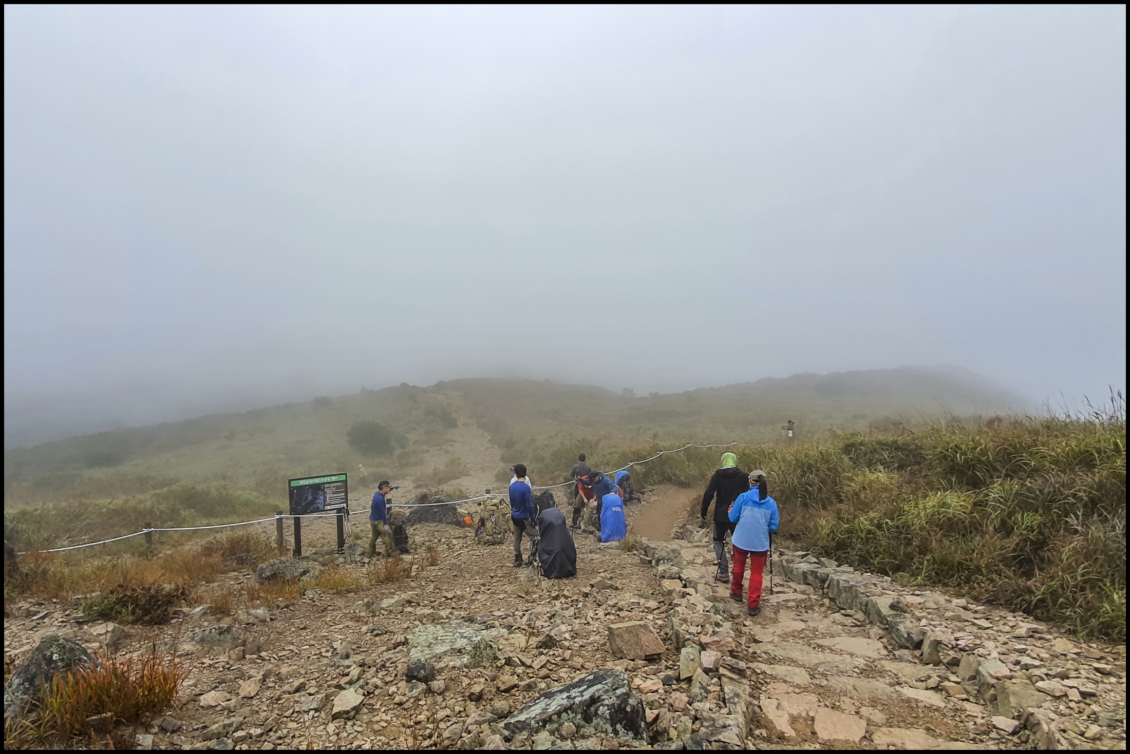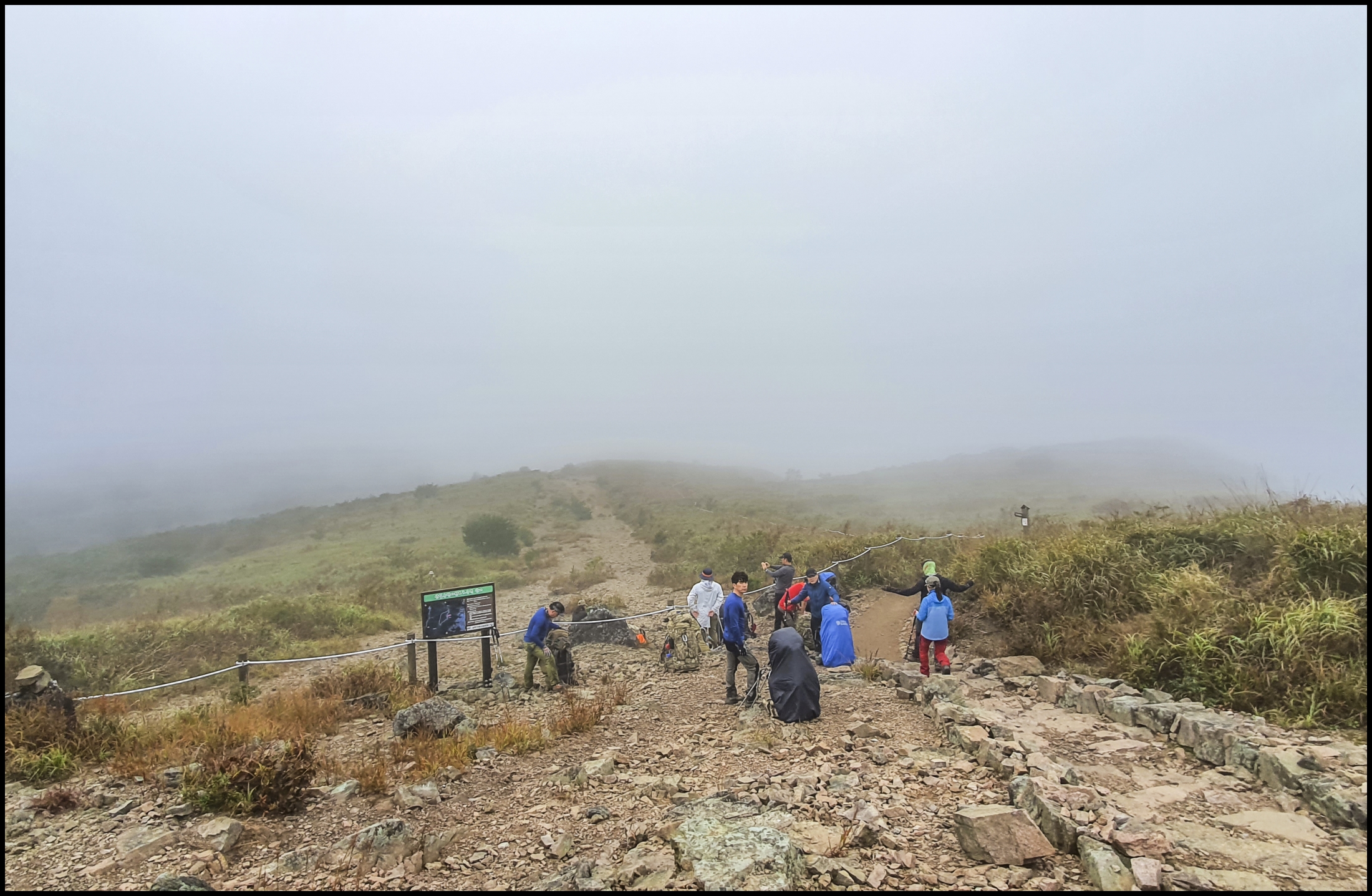 걸어가니 비는 그치고 우리 눈앞을 가리는 운무는 그치지 않고 계속 머물고 있어 구름 속을 걸어가다 보니